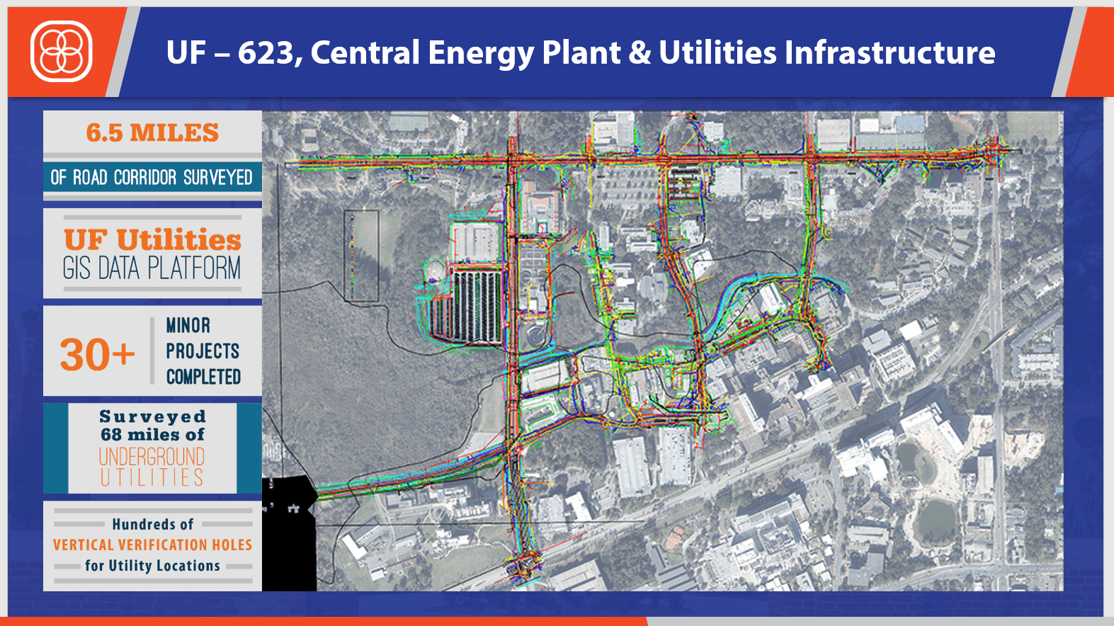Utility-specific projects, such as the UF-623 Central Energy Plant and Museum Road Thermal Replacement, highlight DRMP’s SUE expertise. For Museum Road, DRMP mapped buried utilities using Quality Level B designation, identifying the location, type, size, and material of underground lines. To confirm exact positions, we performed Quality Level A verification with limited test holes and trenching. Hundreds of verifications ensured 141 utility lines and duct banks were accurately documented.