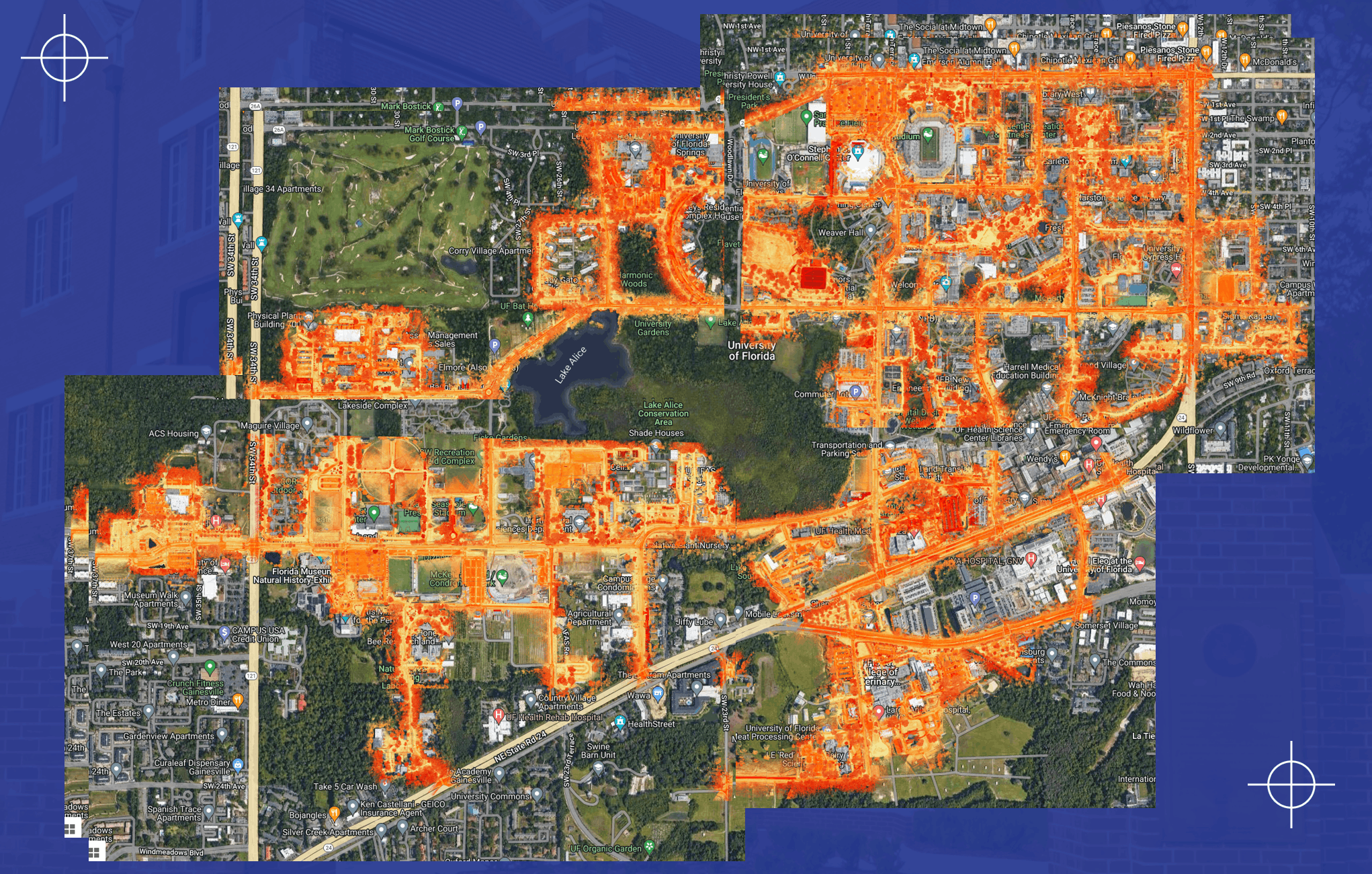 Through an ongoing continuing services contract with UF, DRMP completed a 68-mile LiDAR and GIS survey capturing roadways, parking areas, green spaces, and forested areas around the campus. Mobile LiDAR scans of over 20 miles of roadways assisted with studies on pedestrian safety, ADA compliance, and street lighting. Additional scans of lakes, sports fields, and other areas that are difficult to access produced a fully integrated 3D model of the campus. This dataset allows UF to plan campus growth, coordinate infrastructure projects, and verify design plans without disrupting academic or athletic activities.