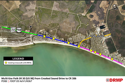 The purpose of the US 98 Multi-Use Path Project is to improve regional and community connectivity with a 4.2-mile path along US 98, starting west of Mexico Beach city limits at Crooked Sound Drive as well as a segment extending from the US 98 and 15th Street intersection along 15th Street to the CR 386 intersection. The project will also improve bicycle and pedestrian safety, provide additional recreational benefits, and promote economic development.