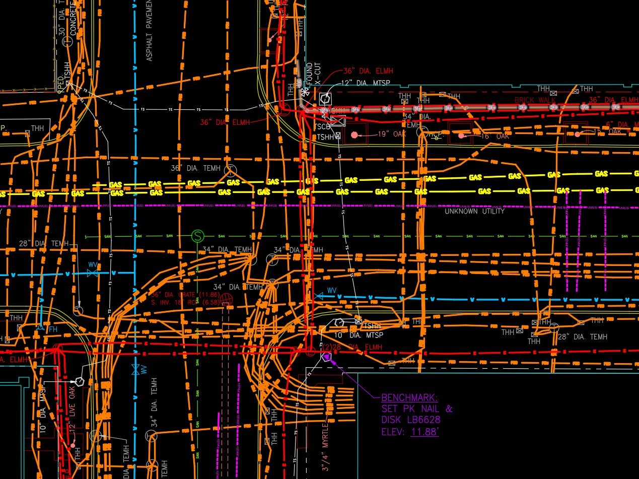DRMP identified 97 utility lines within a block and a half and performed vacuum excavation at 65 test hole locations to provide the engineers with verified vertical and horizontal (VVH) test hole reports on the utilities identified as potential conflicts. The task demanded extraordinary precision from our SUE field crews, considering the vast array of utilities, each varying in generational and material composition.