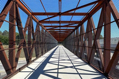 When we designed the new structure, we increased the useable width to 14 feet to match the width of the adjoining trail and relocated the water main line to the outside of the bridge. We also provided additional vertical clearance to accommodate horseback riding. The vertical clearance along the enclosed truss structure is 12 feet. The length of the bridge also increased to 315 feet from 244 feet.