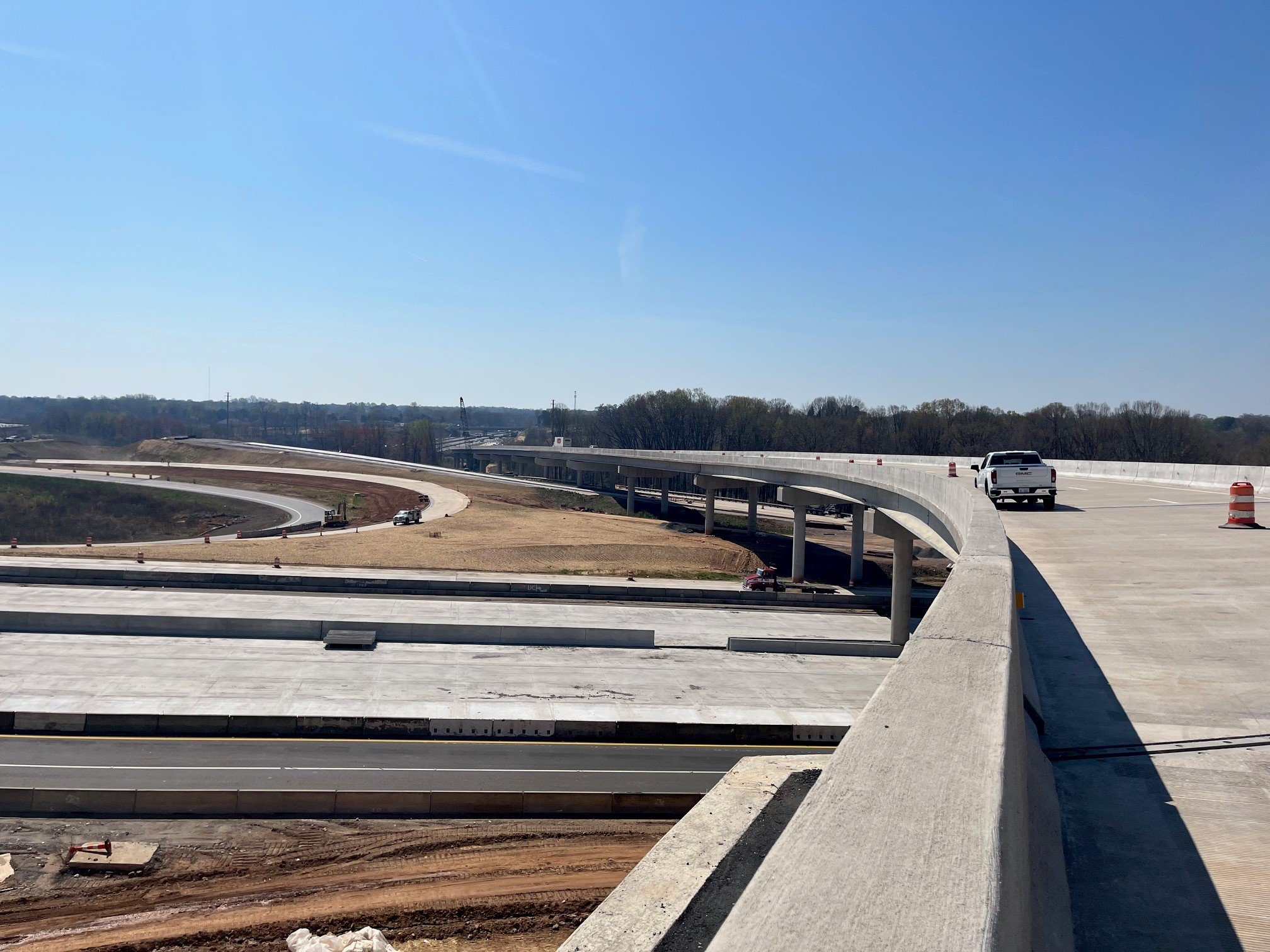 Pictured in the background is the newly opened I-40 westbound to I-77 southbound 2,600-foot flyover bridge, making an easier transition onto I-77 southbound.