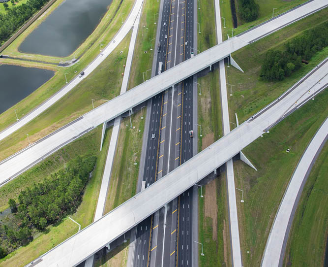 DRMP is the Engineer of Record for this $70.5 million design-build project that realigns nearly two miles of I-4 to the outside to accommodate for the future typical section and HSR. The project will also convert the SR 557 interchange from a partial cloverleaf interchange to a diamond interchange with dual tear-drop roundabouts and emergency stopping areas on both I-4 ramps. SR 557 will be widened from two lanes to four lanes. DRMP’s structural engineers are providing design services for three new bridges: a new 4-lane SR 557 bridge over I-4 using Florida-I 84 Beams, two wildlife crossing bridges along I-4 using Florida-I-36 beams, and a new SR 557 wildlife culvert crossing. To redevelop the applicable roadway and bridges, the project includes drainage, environmental, permitting, signing and pavement markings, intelligent transportation systems, and lighting services.