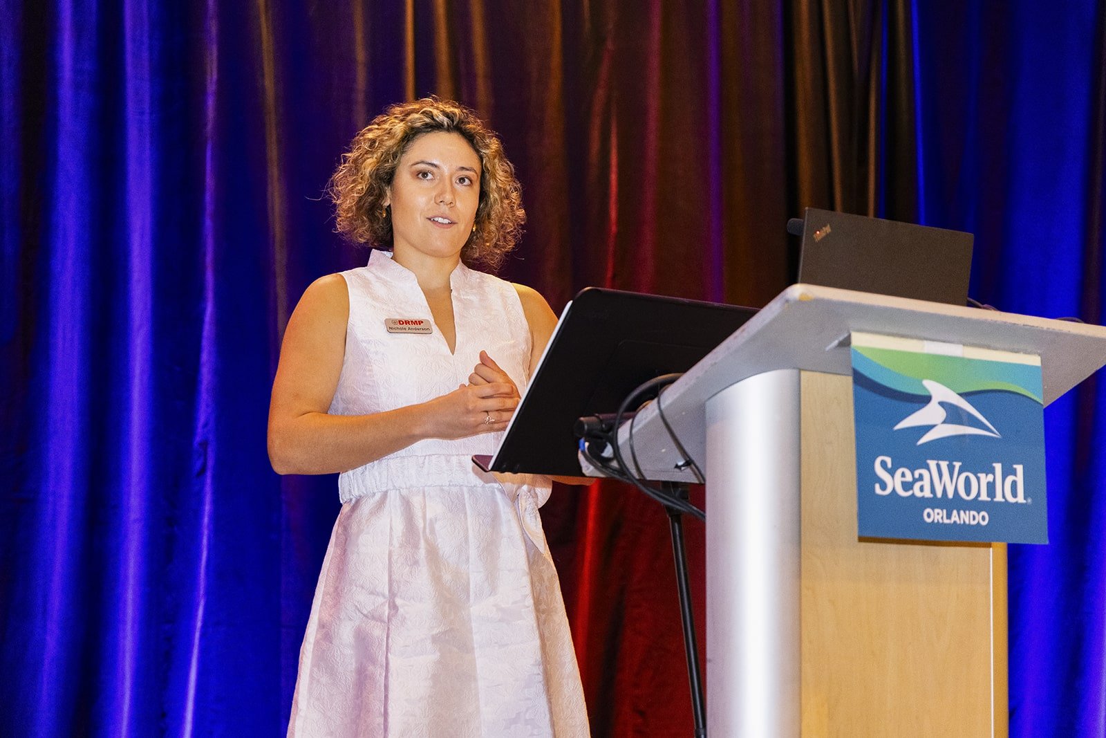 DRMP Roadway Engineer Nikie Anderson, EI, gives an acceptance speech after receiving the WTS Central Florida Chapter Graduate Scholarship. (Photo courtesy of WTS)