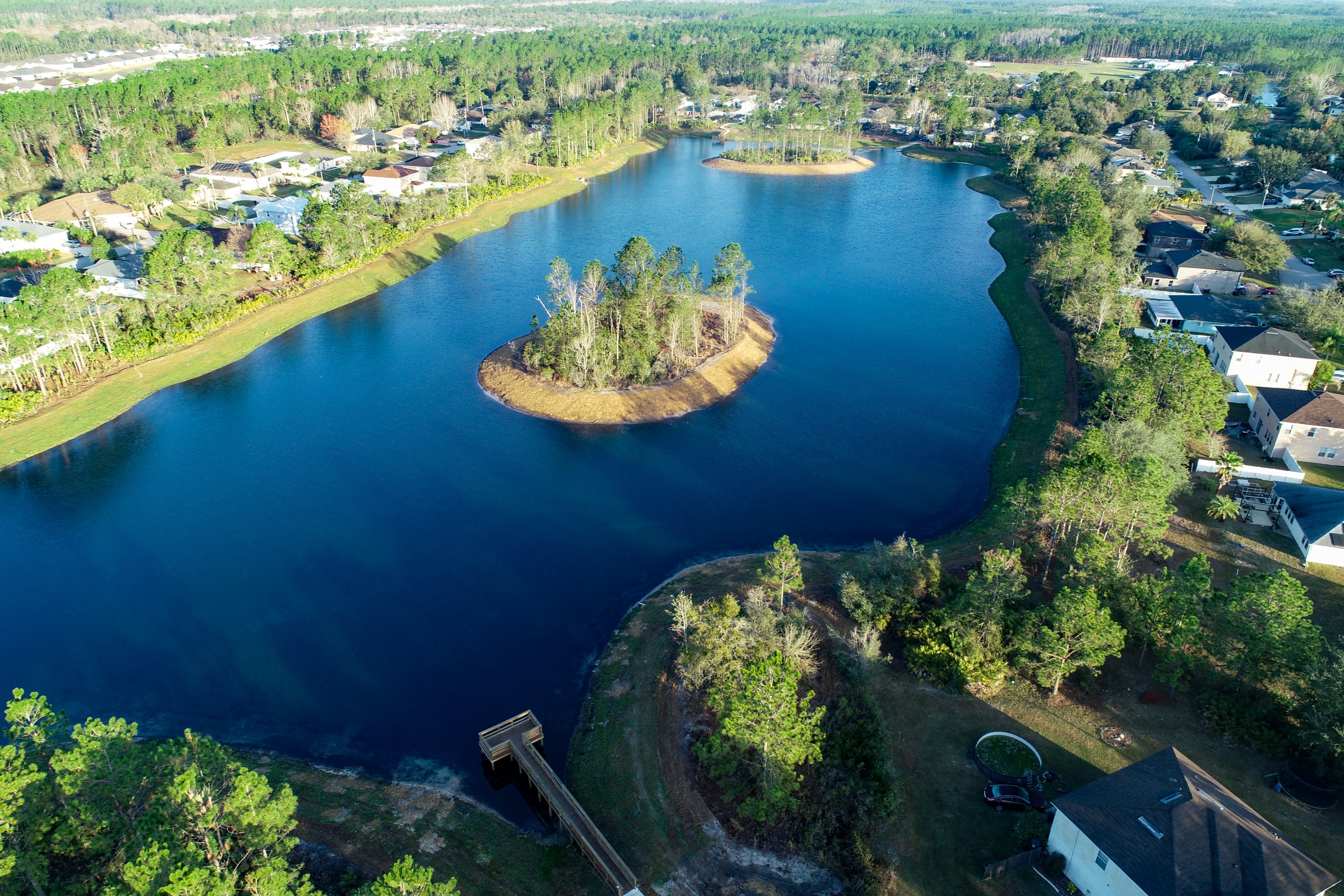 Instead of a traditional retention pond, DRMP designed a 13-acre lake with curving shorelines, two half-acre islands planted with trees to support wildlife, scenic boardwalks, short trails, and native vegetation that promotes habitat creation and controls shoreline erosion. The design takes advantage of the hydraulic head stepdown across the existing LO-1 canal structure to manage water levels efficiently – allowing the lake to remain stable under normal conditions while storing floodwaters during peak events. The result provides flood relief to a broad section of northern Palm Coast.